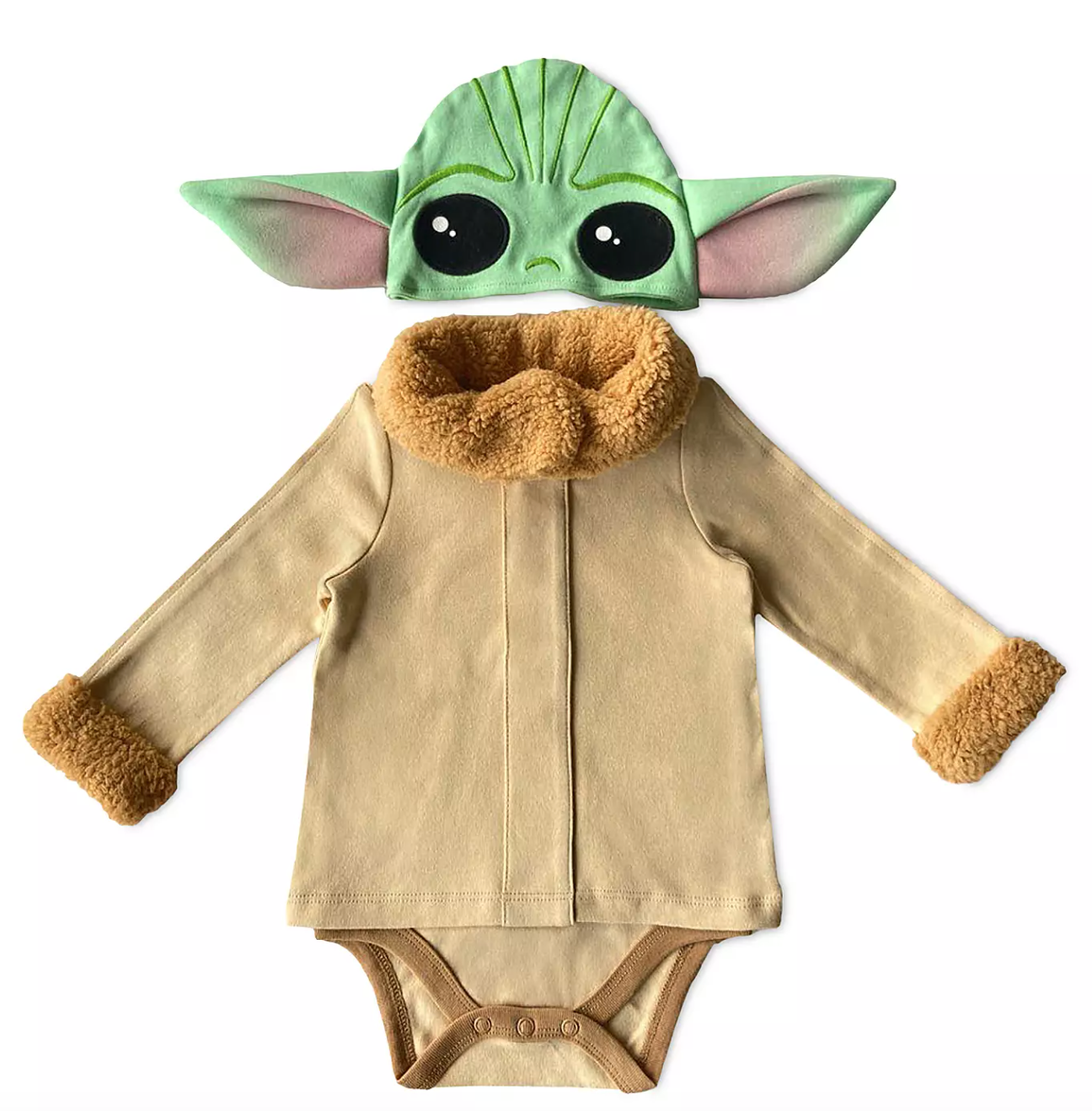 Check out how snuggly this new Baby Yoda Romper for $24.99 looks! It even features the same fleecy cuffs as The Child’s cozy little robe from the Disney+ show! And how cute is the hat that comes with it?!