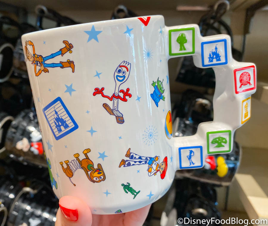 If our favorite characters weren’t enough, the handle of this mug even features building block-like images of Woody, Buzz, and each Disney World Park logo for extra flair.