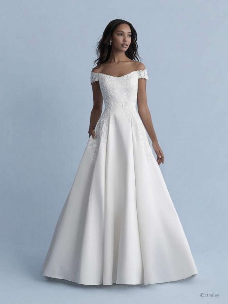 The off-the-shoulder sleeves and satin skirt are straight out of a storybook, don’t you think?