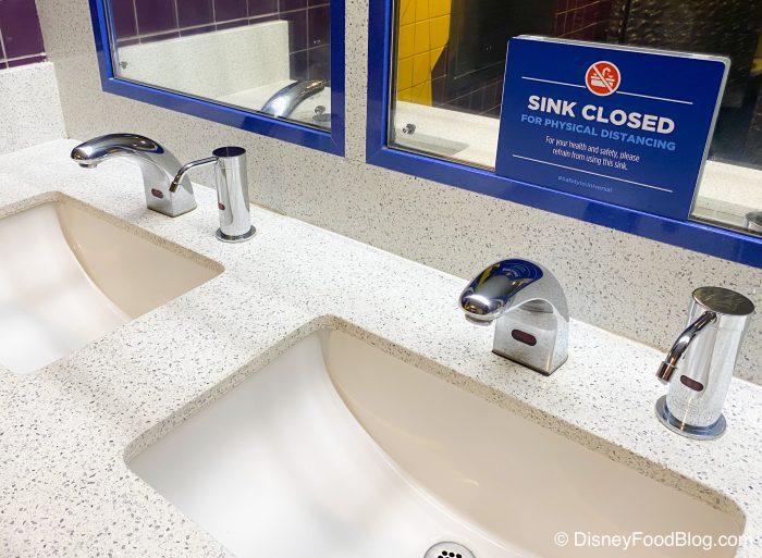 In the restrooms, there was some signage to remind us of the sanitary precautions we could take to mitigate the risk of spreading the virus. We noticed that every other sink in the restrooms was “closed.”