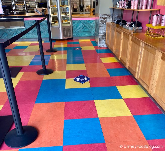 Inside, the floor markers continued. An employee was present to make sure parties did not get too close together.
