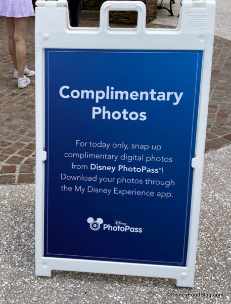 We spotted a sign for Complimentary Photos from Disney PhotoPass! BUT, there’s a small catch…
