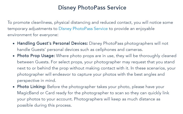 Finally, the website asks that guests have their MagicBands or cards ready for the photographer to quickly scan and link your photos to your account. The goal is to keep as much distance as possible between Cast Members and guests.