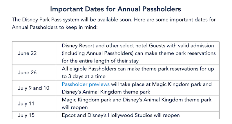 The screenshot below is taken from the Walt Disney World website. Note that while we were aware of the significance of June 22nd and June 26th (you can read more about the theme park reservation that’s mentioned for those dates here, by the way), July 9th and 10th are the dates listed for Annual Passholder Previews at Magic Kingdom and Animal Kingdom theme parks!