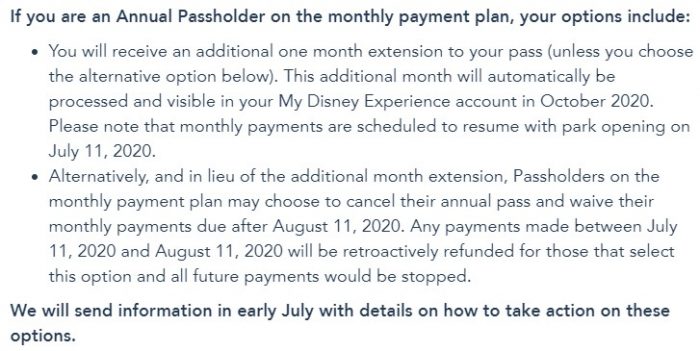 - Receive a one-month extension to your pass. The additional month will be automatically processed and visible in your My Disney Experience account in October 2020. Monthly payments will resume on July 11th.
