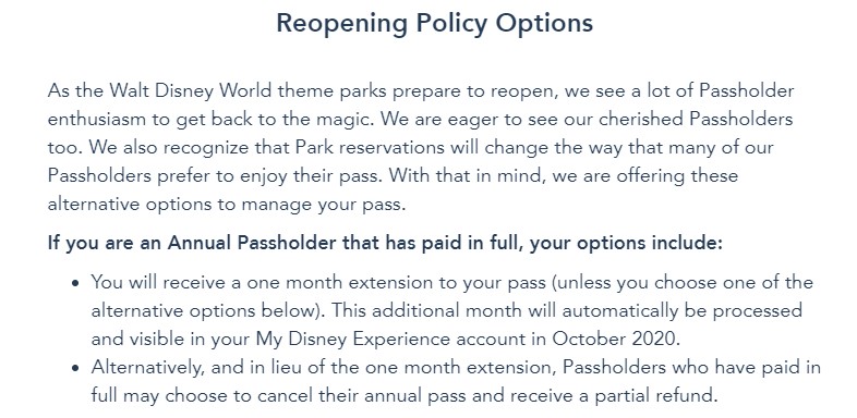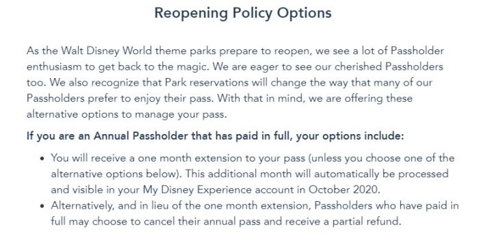 - Receive a one-month extension to your pass. The additional month will be automatically processed and visible in your My Disney Experience account in October 2020.