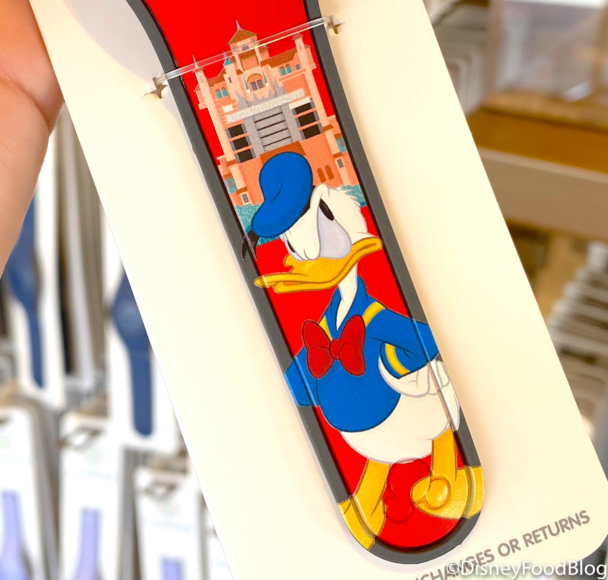 The red band features Donald with his famous sourpuss mug in front of the Tower of Terror (do you think he got a little too scared?)…