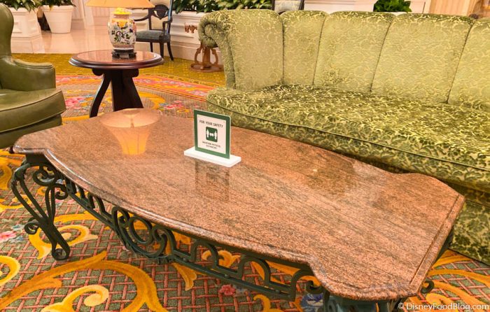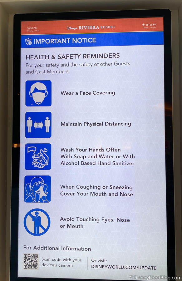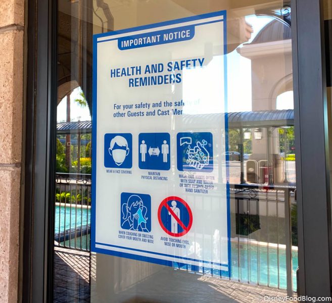 As we entered the hotel, there were signs reminding guests of Disney’s new health and safety procedures. These signs also state that by entering the hotel you are confirming that you don’t have any of the listed symptoms.