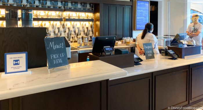We checked in on several quick-service dining locations in Riviera Resort too. Le Petit Cafe had physical distancing signage and added plexiglass barriers.
