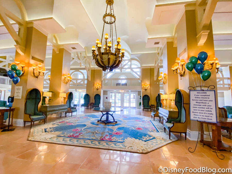 Another thing we were surprised by this morning is how we walked right into our hotel! There are new health and safety signs throughout the grounds stating face coverings must be worn at all times while in common areas, but on-site temperature screenings aren’t currently being performed at any of the Disney World resorts.