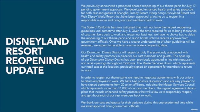 According to Disney, “The State of California has indicated that it will not issue theme park reopening guidelines until sometime after July 4. Given the time required for us to bring thousands of cast members back to work and restart our business, we have no choice but to delay the reopening of our theme parks and resort hotels…”