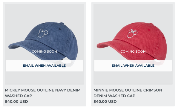 Looking for a pop of color? The Mickey Mouse Outline Navy Denim Cap and Minnie Mouse Outline Crimson Denim Cap both caught our eye! You can snag one of these for $40.