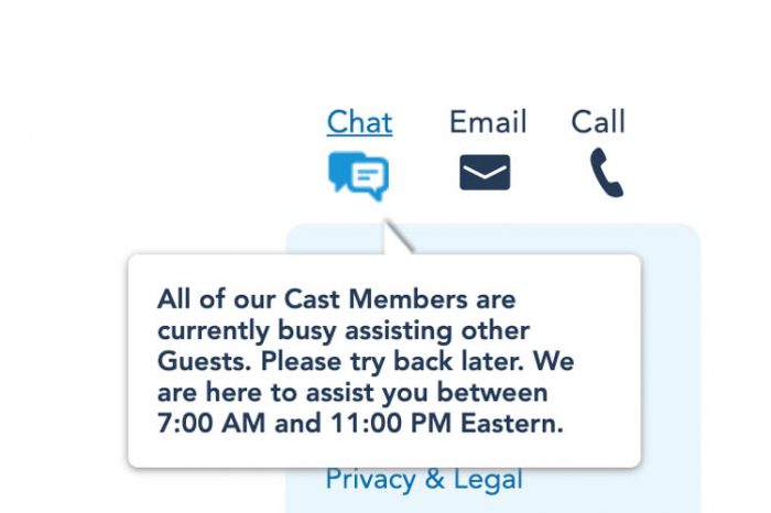 In the past few days, readers have reported being able to share their issues in the chat area after hours-long waits. So even if it looks like nothing is happening in the chat when you activate it, as long as you get a “thank you for your message” prompt, keep that window open and keep watching. Eventually a cast member will respond and you can note your issue. If that cast member cannot help you, they MAY be able to add your phone number to a queue so that another cast member who can help you can give you a call.