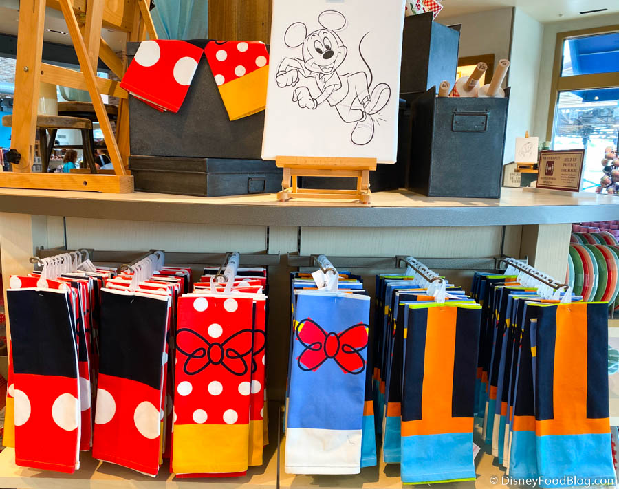 World of Disney in Disney Springs has been THE SPOT to find cute kitchen gear lately! That’s where we spotted these Fab Four Towel Sets a while back, as well as a bunch of character-themed pot holders and aprons last week!