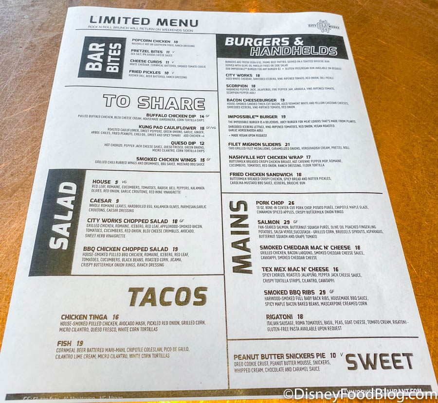 Like most Disney Springs restaurants, City Works is providing limited menus while they ramp up again. Some restaurants are allowing you to scan a QR code that pulls up the menu online while others are sticking with disposable paper menus.