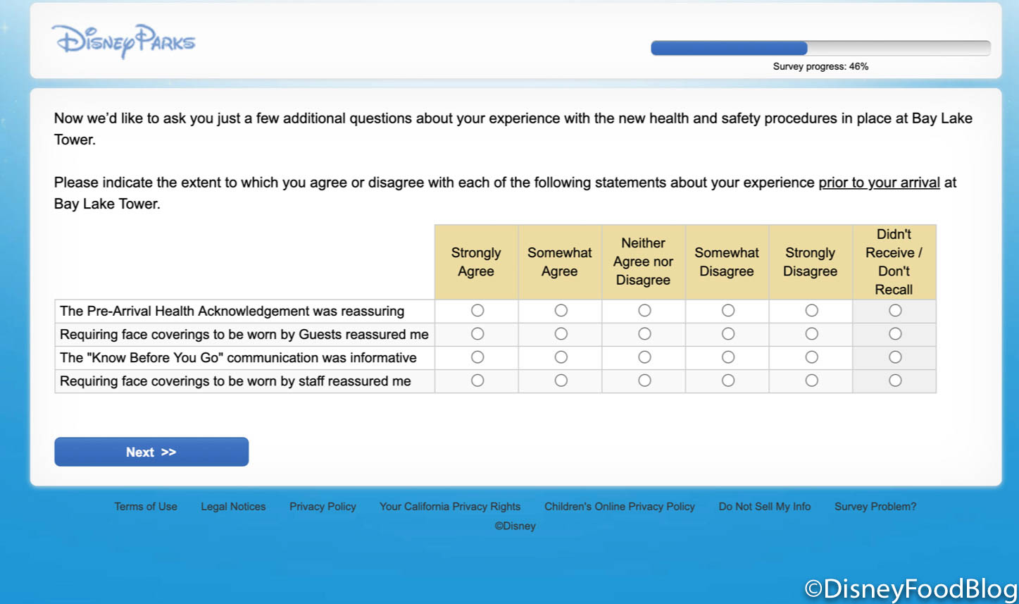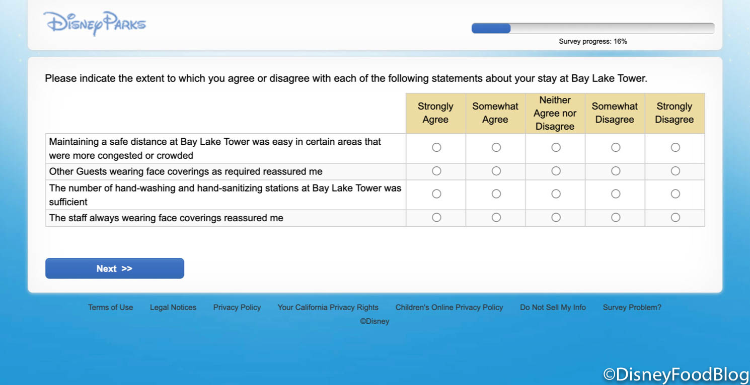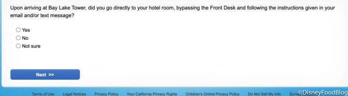 After our stay at Disney’s Bay Lake Tower, we received an extremely detailed survey about our experience at the resort. While it may seem long (it took a bit of time to complete!), these surveys help Disney continue to expand upon their existing guidelines and create new ones based on the feedback they are given.