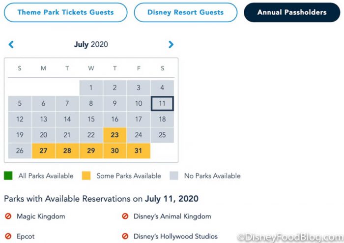 While some days had originally booked up at certain parks, Disney added more park passes to the formerly “sold-out” dates so that Annual Passholders would have the opportunity to snag them. Passholders quickly snatched up many of the available passes for the initial month of reopening. In fact, while a few readers noted that they got them, we never saw availability to Magic Kingdom on opening day (July 11th) for Passholders, but currently all other categories can still get Park Passes to that park on that day. Here’s the Passholder availability calendar at the time of writing: