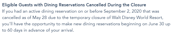 Now we were a little confused about this. And, tbh, we still are. This date applies to guests who had their dining reservations on or before September 2nd canceled as of May 28th. But did the dining reservations have to be canceled by Disney to count us eligible? What if WE canceled the dining reservations BEFORE May 28th…but it was still due to the closure? Does that still count?