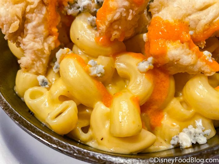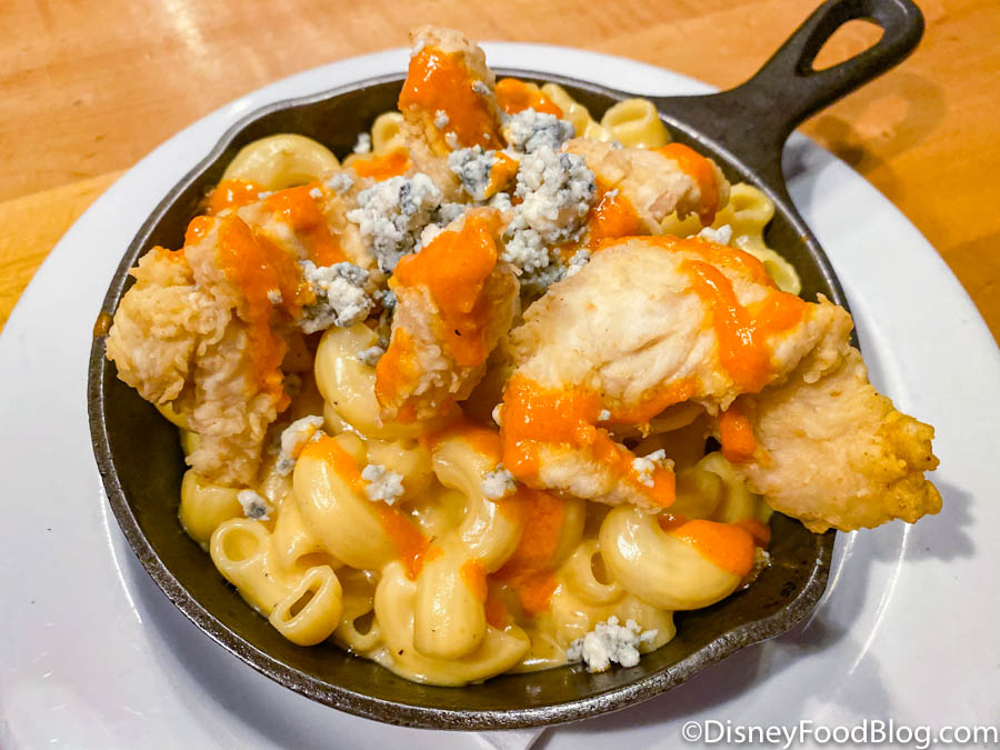 Served in a hefty skillet, this cheesy pasta was topped with chicken tenders, Buffalo sauce, and blue cheese.