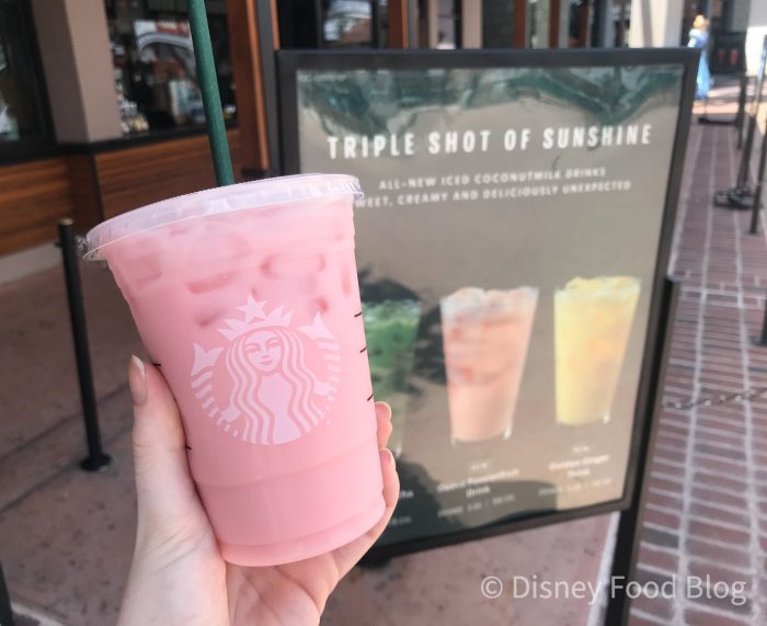 We stopped by Starbucks in Disney Springs for a drink this afternoon, and we noticed a sign advertising three new beverages made with coconut milk. We’ve already tasted the Pineapple Matcha Drink and Golden Ginger Drink, so we had to give the Guava Passionfruit Drink a try!