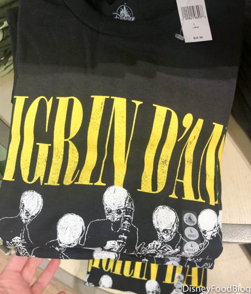 Blame it on our ’90s grunge days, but when we looked down and saw what we thought was a classic Nirvana “Smiley” shirt, we were surprised to see it was ACTUALLY a band tee for Figrin D’an and the Modal Nodes! It has the EXACT same yellow lettering as the iconic Nirvana tee!