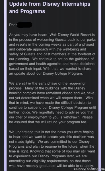 Thanks to a reader, we can share the email that the college program participants are receiving. In it, Disney explains that due to the nature of the reopening process, the Disney World College Program will continue to remain suspended.