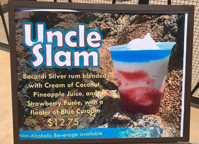 The Uncle Slam is available at Polynesian Village Resort’s Barefoot Pool Bar for $12.75. If you snag it, you’ll be sipping on an all-American combo of Bacardi Silver rum blended with Cream of Coconut, Pineapple Juice, and Strawberry Puree, with a floater of Blue Curacao.