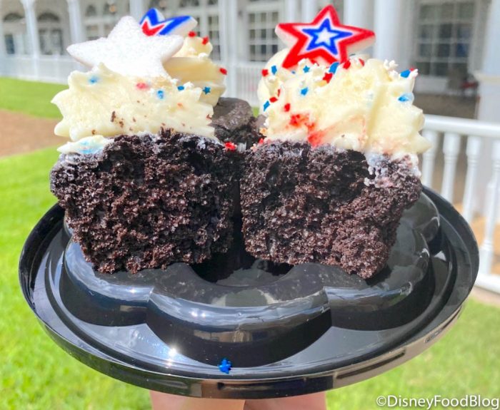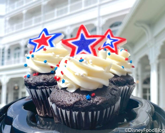 While we’ll be taking you all around the hotels to try their Fourth of July treats, we’re stopping at Disney’s Grand Floridian Resort (after snacking on that AMAZING cupcake at Disney’s Polynesian Village Resort). Although we’ve already tried the Fourth of July Blondie Pop at the Grand Floridian, we’re snagging the star-spangled Fourth of July Cupcake(s) too!
