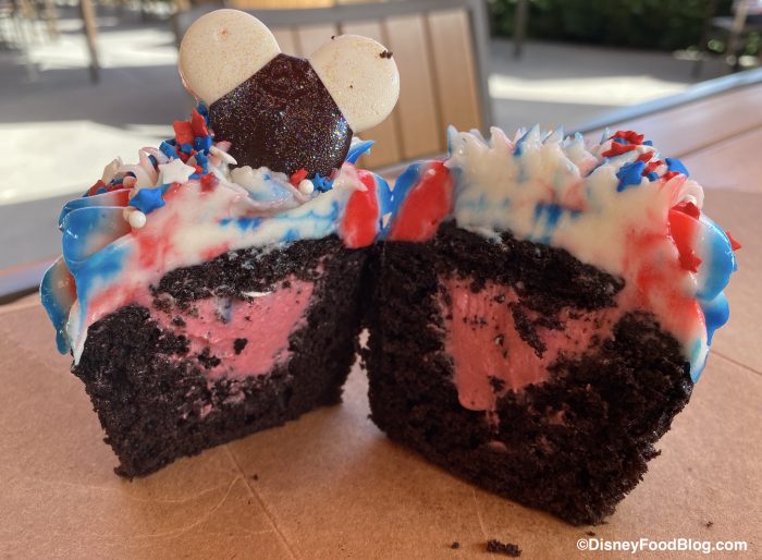 This patriotic treat consists of a chocolate cupcake, with raspberry cream cheese filling, buttercream frosting, sprinkles, and a chocolate Mickey! And Mickey was even topped with some edible glitter!