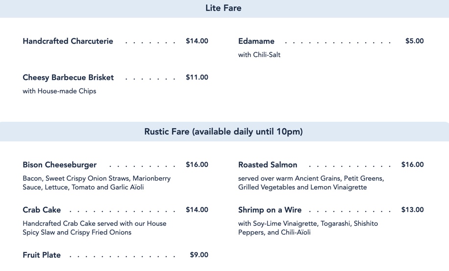 They are offering the same counter service menu (listed as “Rustic Fare”) at the bar as well as some Light Fare you’ll only find here…