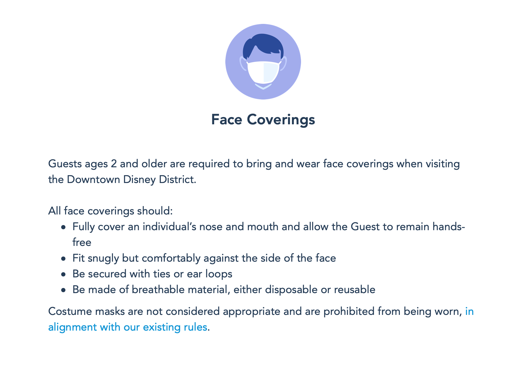 We have previously seen gaiters accepted at Disney Springs and we know some guests may intend to use them as their face covering when the parks reopen. BUT FOR NOW, we strongly suggest that you bring an additional style of face mask if your first choice is a gaiter. Even though Disney World’s website doesn’t explicitly prohibit the use of gaiters, we think based on the language that there’s a good chance they won’t be allowed. We recommend you carry a few ear loop or tie face masks as a backup, just in case. Better safe than sorry — and A LOT better than being turned away for not having a sufficient face mask!