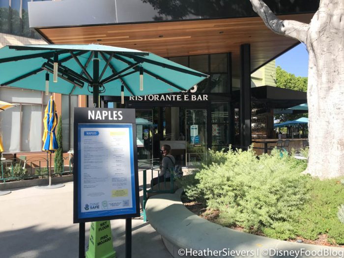 So, what’s it like dining in a newly reopened Downtown Disney restaurant? Naples was NOT seating people indoors, so we were seated at a table outside.