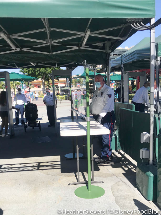 After passing through the temperature check, guests will be required to have their bags screened and pass through the metal detectors. Plexiglass barriers have installed between guests and Security Cast Members who are conducting the bag checks.