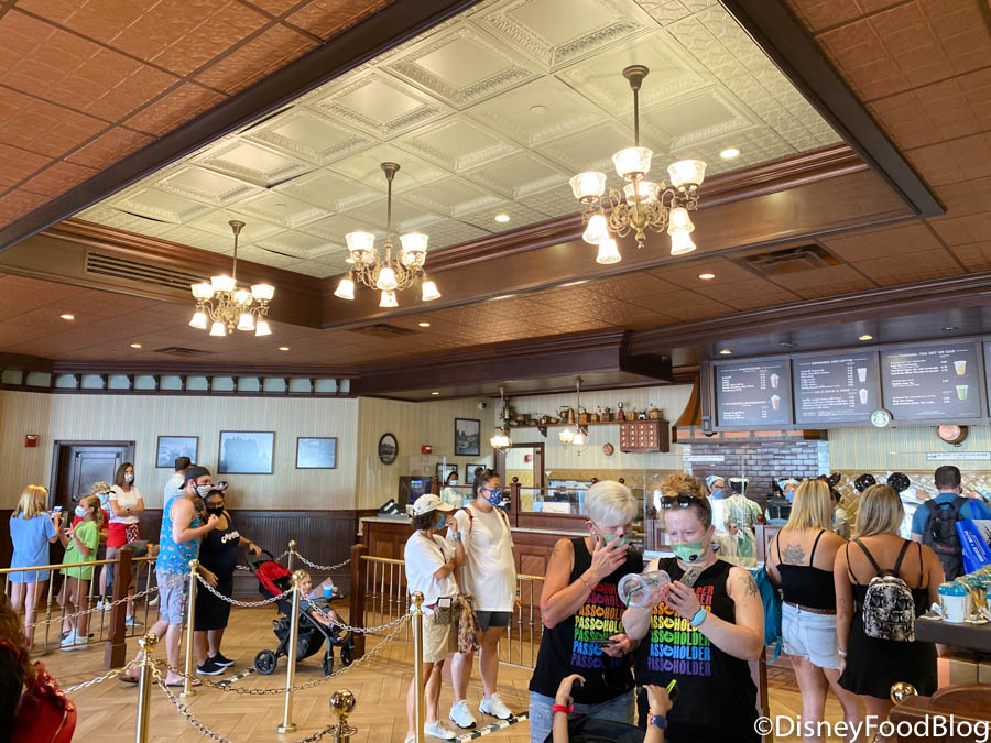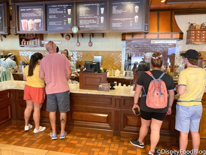 Plexiglass shields have been installed at all the registers and guests are held at the register after they order until a spot over by the pickup window opens up. Guests are encouraged to use contactless forms of payment such as MagicBands, Apple Pay, or the Starbucks app.