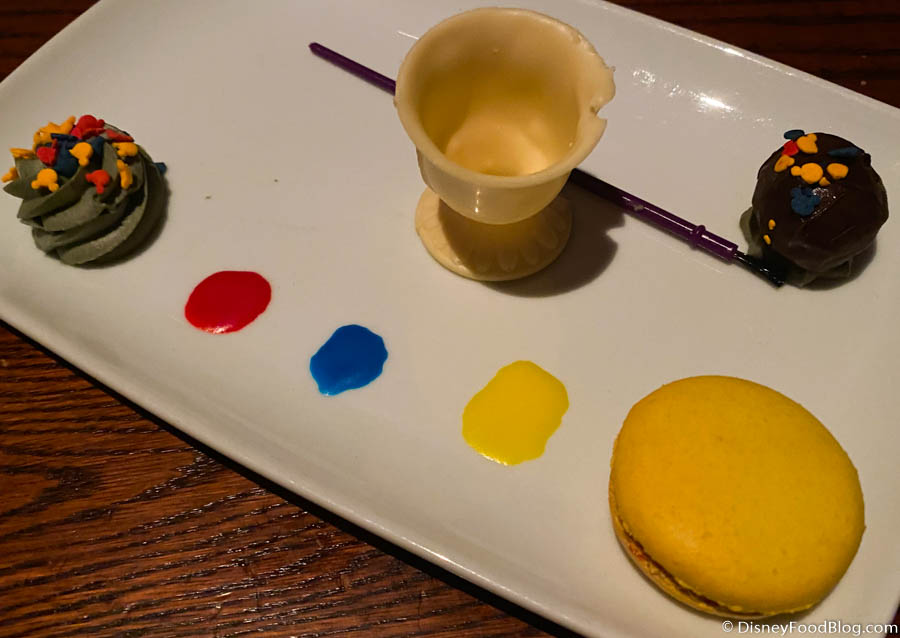 There’s a super sweet version of the Dessert Trio for kids too! It gives them the opportunity to eat some sweets AND play with their food. What more could a little one want? This one combined grey stuff, a cake pop, and a white chocolate Chip cup that the kids could decorate with the edible paints provided. There was also a macaron here, but it was more sweet than tart for sure.