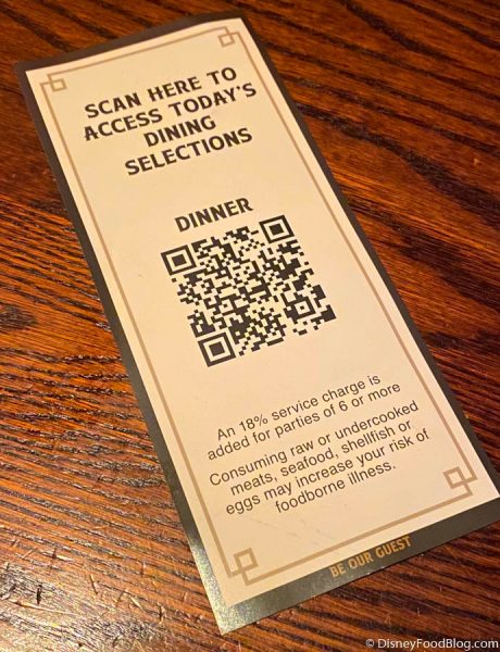 Once seated, we were able to access our menu via the QR code on the table. Remember, Be Our Guest has a prix fixe menu for lunch and dinner (the only available mealtimes right now). For adults, it’s $62 and for kids, it’s $37.