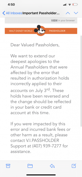 Now, Passholders have started to receive emails from Disney apologizing for the inconvenience. The message states all charges have been reversed and should be reflected on your bank account or credit card statement at this time.