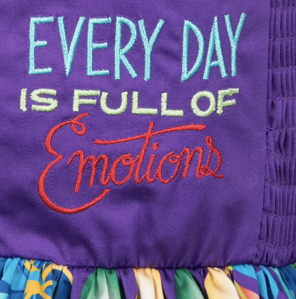 The back features a cheeky stitch that says “Every Day is Filled with Emotions.”