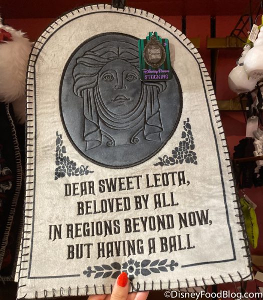 Call in the spirits wherever they are at! This stocking features our favorite happy haunt, Madame Leota. (You know, the woman who’s head is inside a crystal ball on The Haunted Mansion?!) The stocking is modeled after her tombstone that you see on the way into Haunted Mansion. Don’t worry, her eyes won’t follow you here!