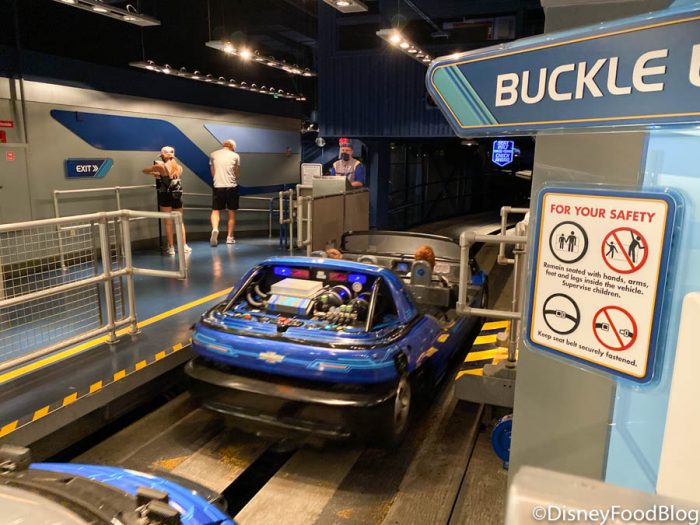 The ride was just as thrilling and exciting as we remembered it! And don’t worry about your mask flying off — the speed of the car keeps it pretty much glued to your face. Plus the breeze from zooming around is refreshing and just the quick cooldown we needed. Upon exiting, you can see the scoreboard isn’t working right now since guests aren’t customizing their cars.