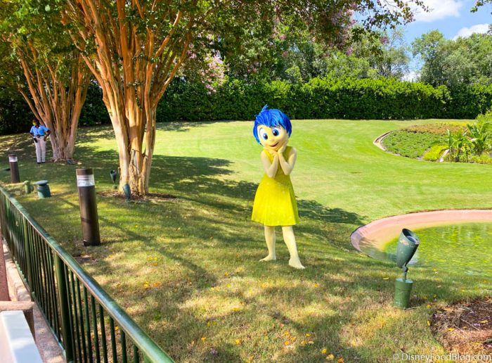 The first EPCOT character we spotted was Joy from Inside Out. She was smiling and interacting with us from the other side of a fence near a grassy area.
