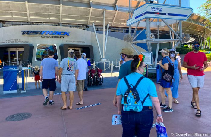 Test Track was a pretty popular ride today. At one point we saw the distanced queue reach a listed wait of 45 minutes.