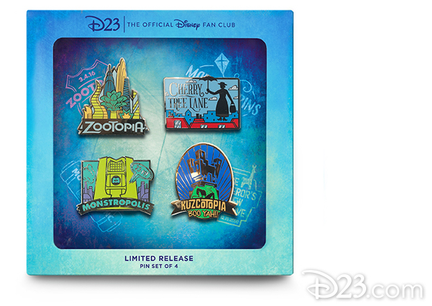 The new D23 Fantastic Worlds Pin Set features four pins “depicting favorite Disney destinations” including Cherry Tree Lane from Mary Poppins, Kuzcotopia from The Emperor’s New Groove, Monstropolis from Monsters, Inc., and Zootopia.
