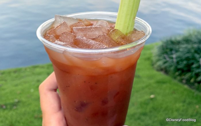 Zing Zang is a brand of bloody mary mix you can buy at the store (which we may or may not have become well-acquainted with over the last few months…). That being said, it was wonderful enjoying this drink next to the World Showcase Lagoon today instead of on our couches. The drink has the perfect blend of spices that really ZING on our tastebuds!