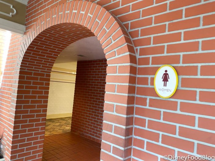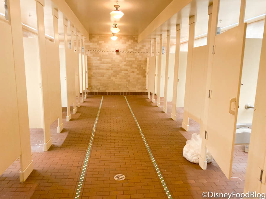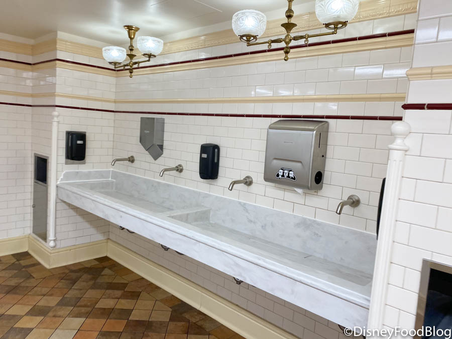 This spot next to Guest Relations is actually one of Magic Kingdom’s smaller restrooms. There’s only a few stalls and sinks and we actually didn’t notice any safety modifications inside this one. To us, it appeared to be a normal restroom.