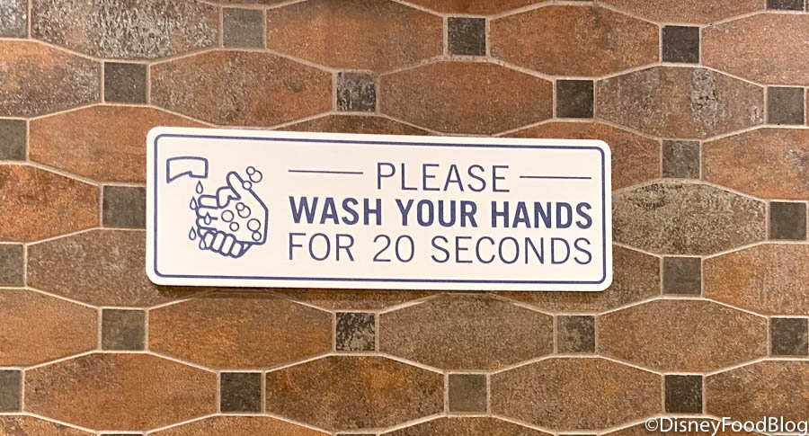 But in other restrooms, we DID notice some signs near the sinks reminding guests to wash their hands for at least 20 seconds. They’re not consistent throughout all the restrooms, but they’re a helpful reminder in case you need one!