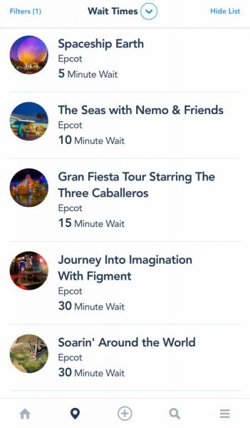 When we checked in again an hour later, some wait times had crept up. Gran Fiesta Tour was up to 15 minutes while Journey into Imagination with Figment has a noticeably longer wait time of 25 minutes.