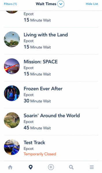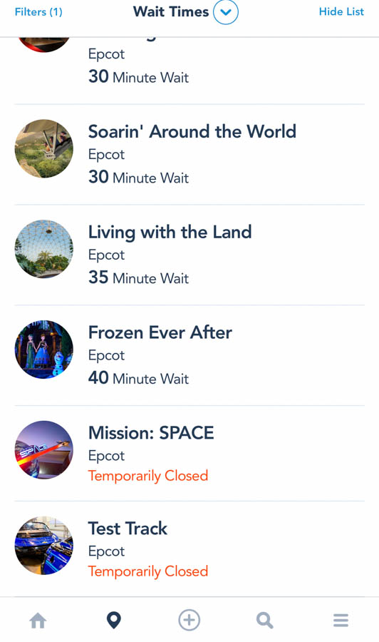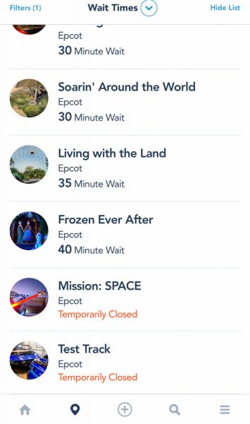 Meanwhile, Living with the Land popped back up to 35 minutes and Mission: SPACE joined Test Track on the temporary closures list due to breakdowns!