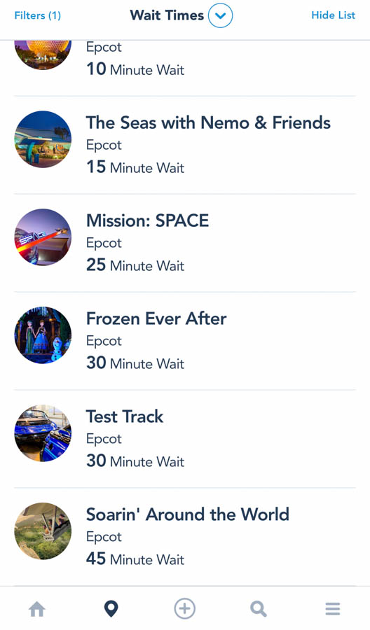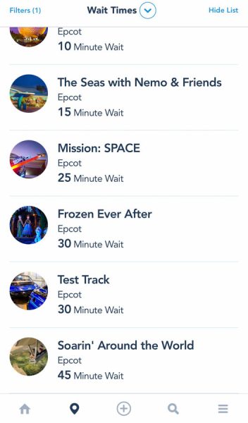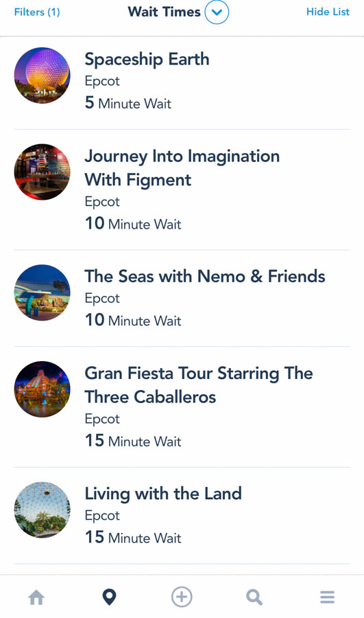 EPCOT opened at 11AM this morning, but wait times weren’t showing up in the My Disney Experience right away. Around 12PM the system was chuggin’ along better and we could see the crowds were giving Living with the Land, Spaceship Earth, and The Seas with Nemo & Friends some lovin’.
