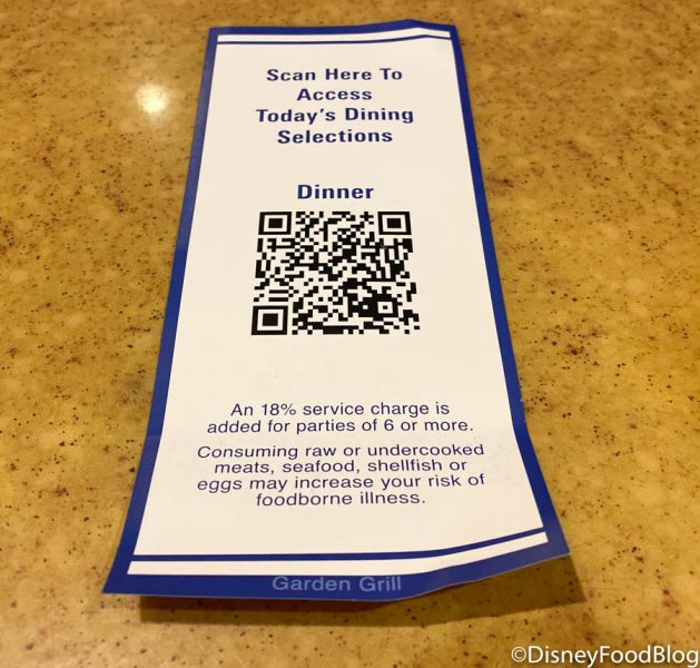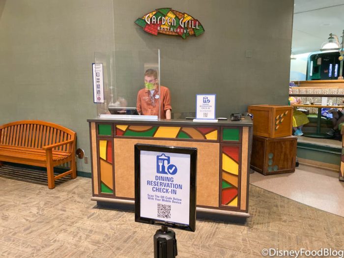 Garden Grill Restaurant is utilizing the new Mobile Dine Check-In feature on the My Disney Experience app. By simply scanning a QR code, you can notify the restaurant you’ve arrived. Additionally, plexiglass barriers have been installed at the host stand.